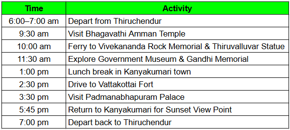 This one-day package is perfect for travelers with limited time who still want to experience the essence of Kanyakumari — from temples and monuments to palaces and the iconic sunset.